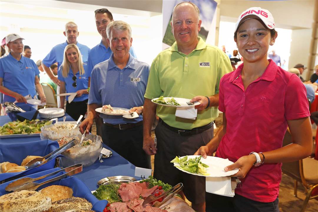 From 3rd from right: Tom Metzgers, BJ Claus and pro Lisa McCloskey during lunch for the 2014 13abc/PNC Pro-AM at Highland Meadows Golf Club in Sylvania.