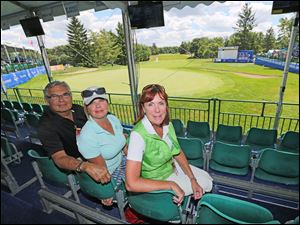 Left to right Evelyn Evans-Eck of Toledo, Chris Johnstone of Maumee, and Jessica Biggs of Sylvania watch from the 18th hole sky box during the Marathon Classic presented by Owens Corning and Owens-Illinois.
