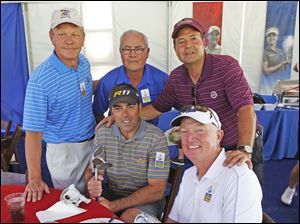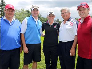 Sitting from left: Joe Assenmacher and Emmett Boyle; from left back: Randy Oostra, Dennis Assenmacher and Jeff Kuhn, during lunch inside the Champion's Pavilion at the Pro-Am at Highland Meadows Golf Club in Sylvania.