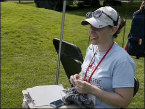 Toledoan Sarah Sagaser, Hole 10 score keeper, knits a shawl between golf groups during the 2014 13abc/PNC Pro-AM at Highland Meadows Golf Club in Sylvania.