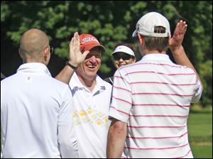 Faris Caleca watches Bruce Umbleby, center, and Todd Daily high-five during the Health Care REIT/Brooks Insurance Pro-Am at Inverness Club in Toledo.
