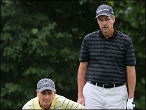 Jim Garrett, left, and Don Malarky line up a shot during the Fathead Celebrity Pro-Am during the Marathon Classic presented by Owens Corning and Owens-Illinois.