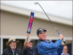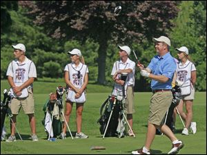 Local caddies watch Tim Griffith tee off during the Health Care REIT/Brooks Insurance Pro-Am at Inverness Club in Toledo.