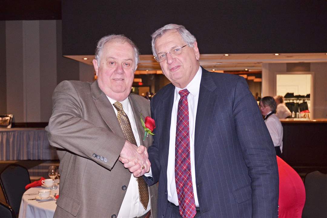 Judge Jack Puffenberger, Bernie Quilter, Clerk of Court, Henry Herschel Esq, Joe Zerbey, President of the Blade, Martin Holmes, Master of Ceremonies Dan Saevig, Central Catholic High School President, Tom Maj participated in the roast.