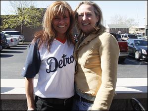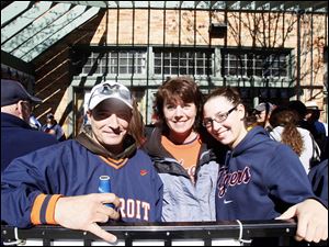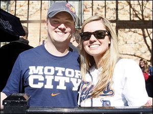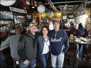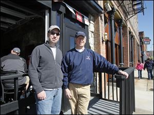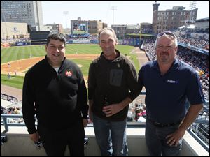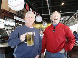 Corey Morris, left, and Brian Crow, right, enjoy the festivities at Pizza Papalis near Fifth Third Field before the Toledo Mud Hens and Detroit Tigers exhibition game.