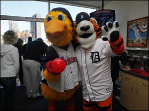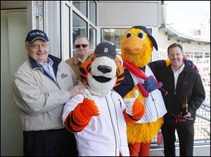 Detroit and Toledo mascots visit with Joe Zerby, left, Mark Ralston, center, and Mark Ridenour, right, in the Block Communications suite.
