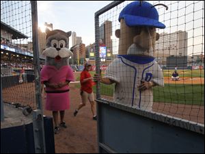 Characters Kitty Holmes and Jim Flealand leave the field after racing each other between innings. Their names are a play on Toledo-native actress Katie Holmes and Detroit Tigers manager Jim Leyland.
