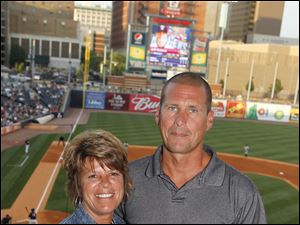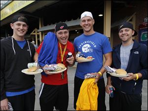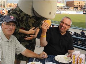 Chuck Brown feeds Jamie Farrmadillo a burger as he dines at Fifth Third Field with Greg Brown.