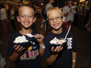 Jack Tanner, left, and Jordan Judkins, both of Adrian, Mich., eat ice cream out of batter helmets.