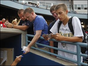 Justin Kay, James Hartz, Alex Larnhart, and Tyler Agard seek autographs from players.
