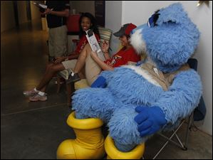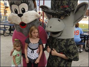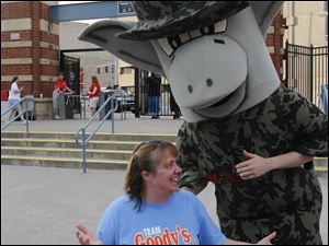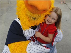Toledoan Olivia Wireman gets a hug by Muddona, the Mud Hens' female mascot.
