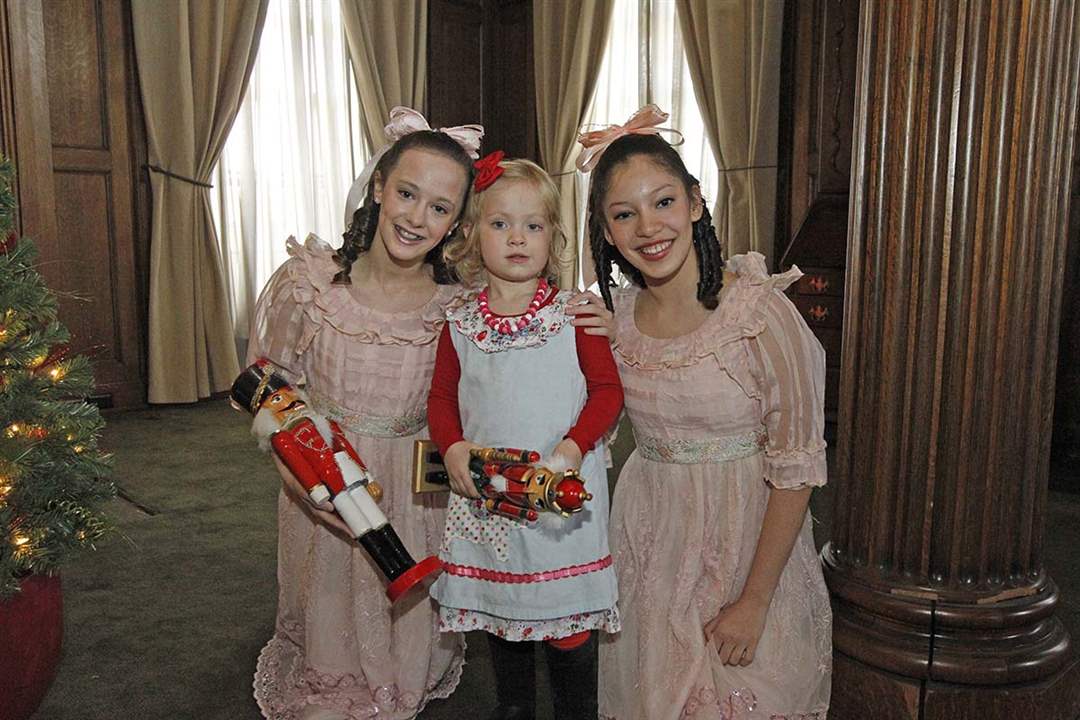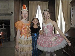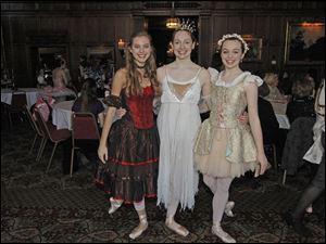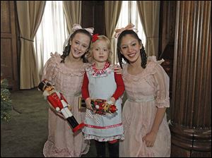 Ellie Kammeyer, 3, center, has her picture taken with "Clara" played by both Madeline Rick, 13, left, and Catherine Orchard, right, 13, during the annual Tea with Clara and Friends presented by the Toledo Ballet dancers in the Nutcracker at The Toledo Club.