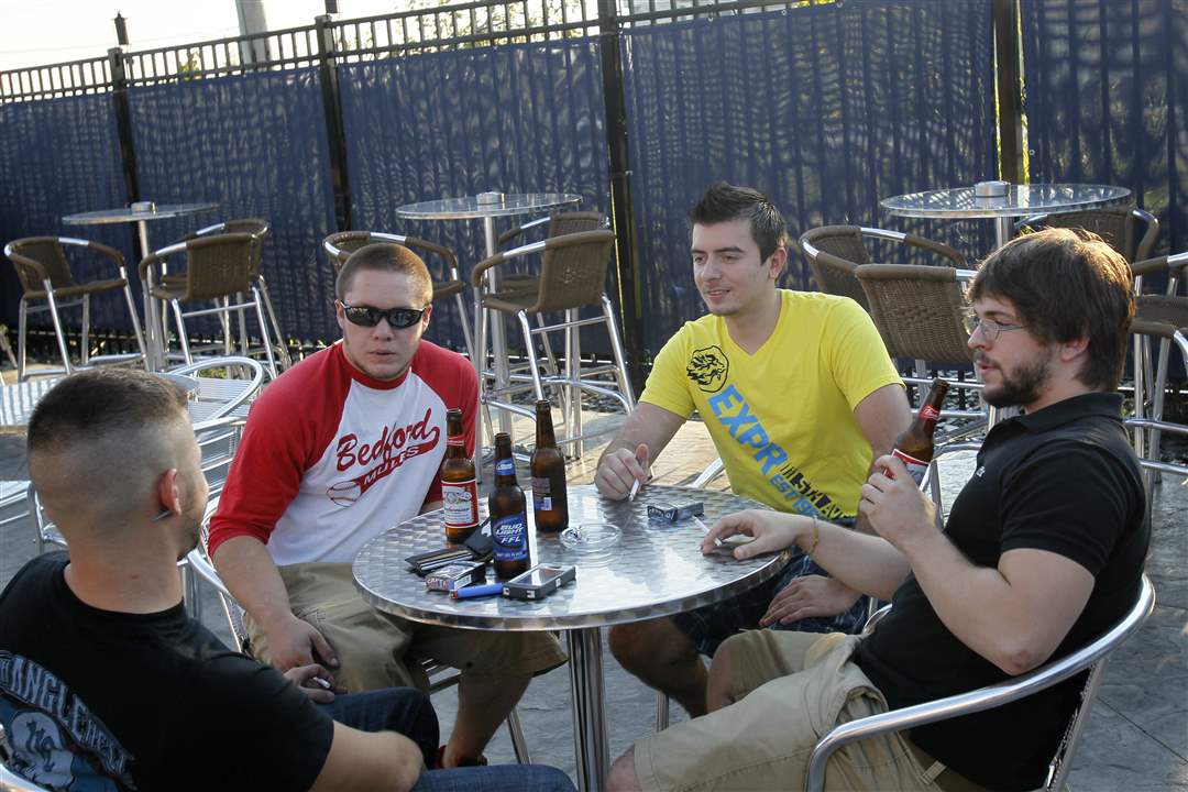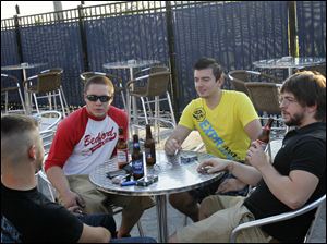 Randy Martin, of Toledo, from left, Wayne Bradfield, of Toledo, Craig Lopez, of Maumee, and Sean Gabalac, of Toledo, share a drink at Arnie's in Perrysburg.