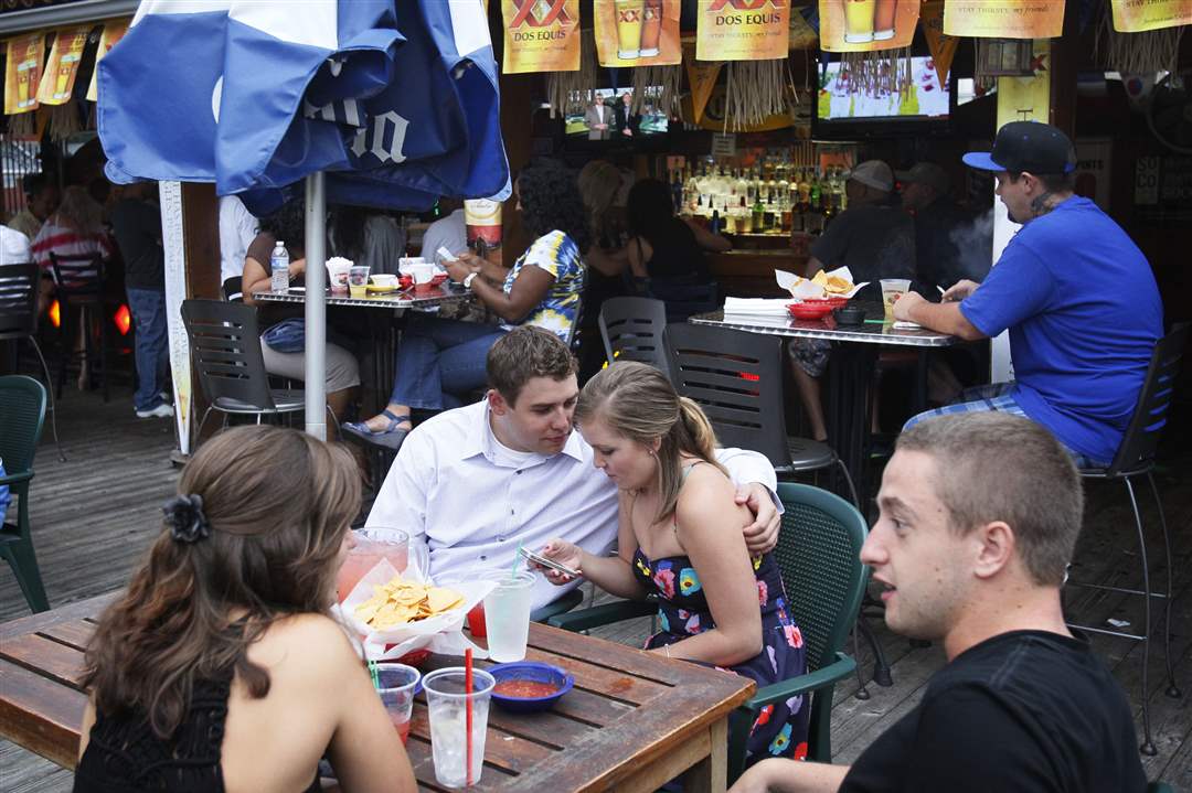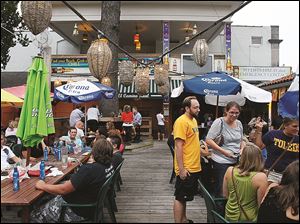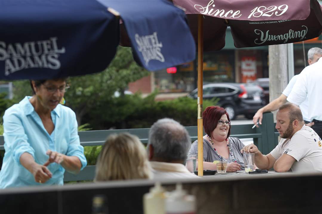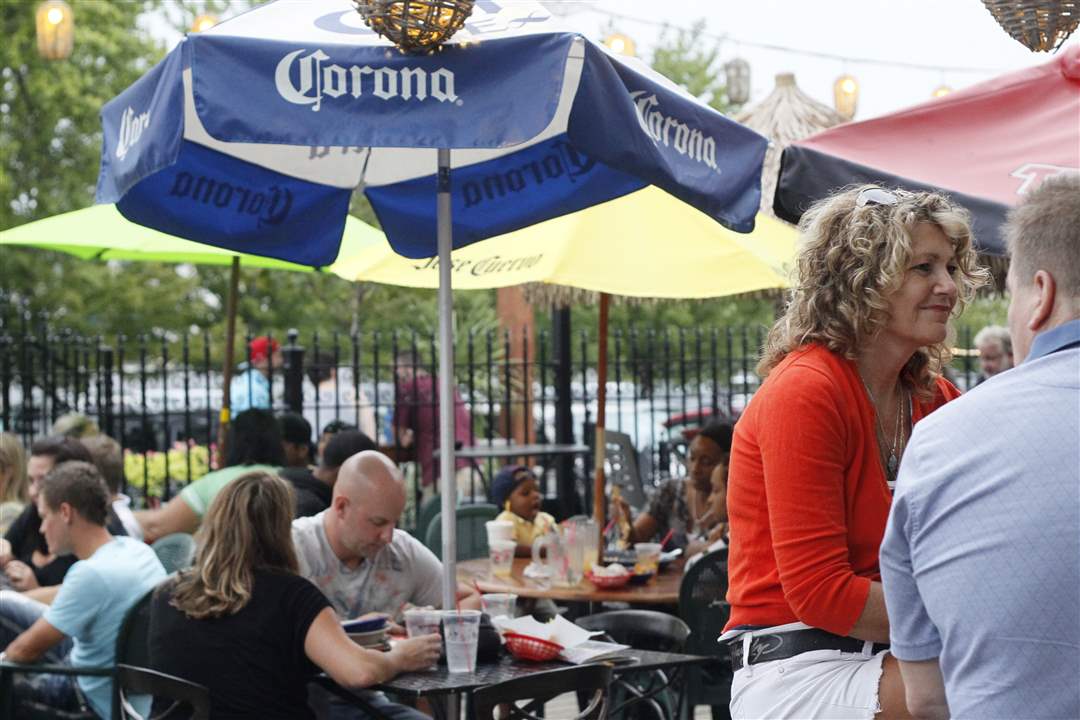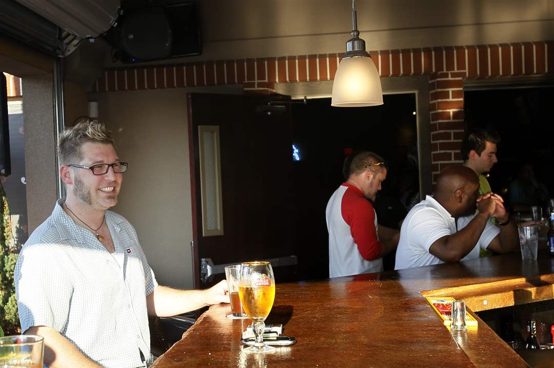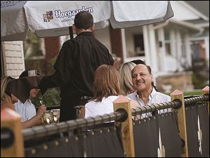 Ben Bomlitz, of Perrysburg, left, has a drink at the bar on the patio of Arnie's in Perrysburg. The bar at Arnie's extends from the inside of the dining area to the patio.