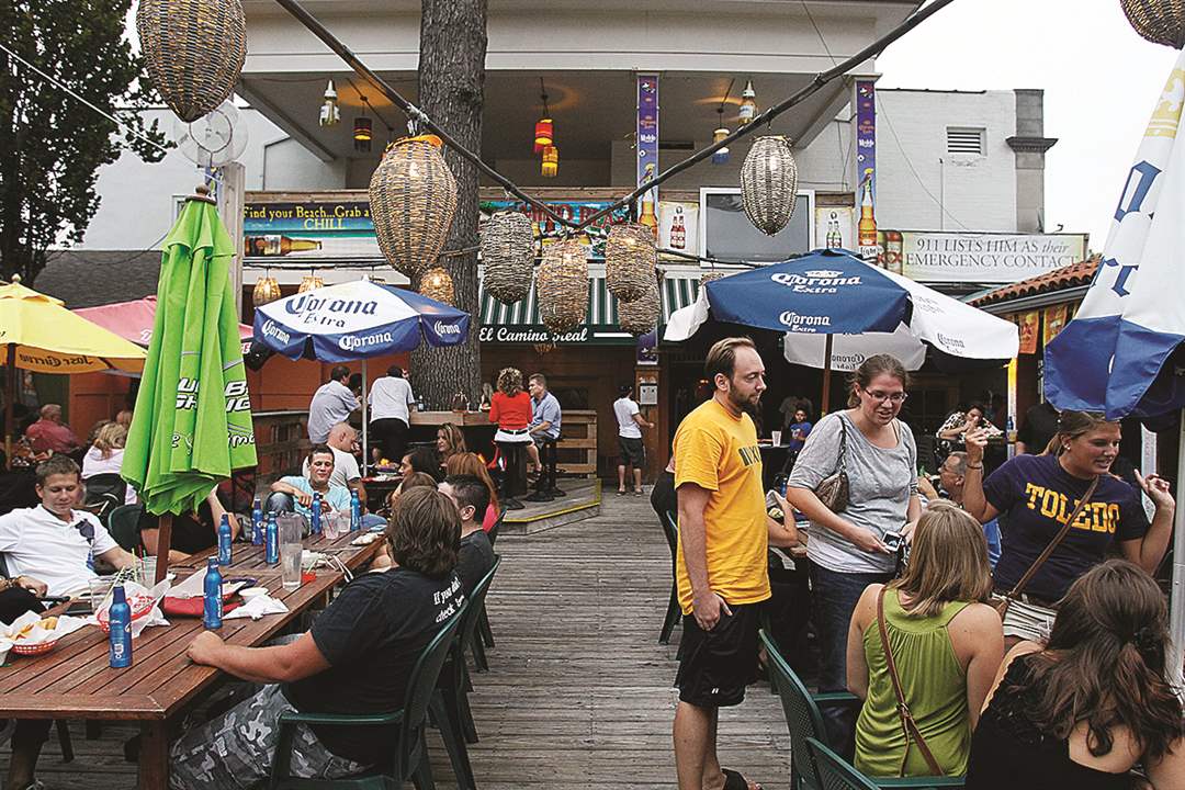 Dozens of people pack the patio of El Camino Real on a summer day.