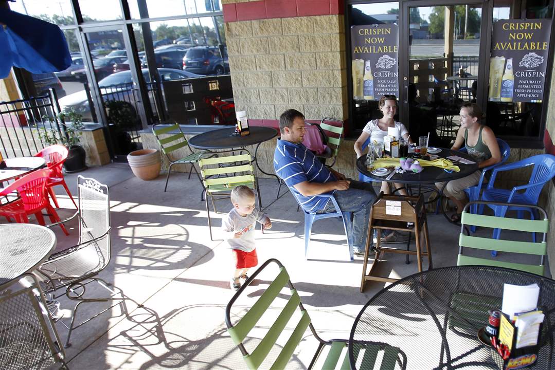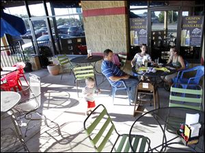 Diners, from left, Dan Righi, Erin Righi, Ashley Blohm, and Jackson Righi, 2, enjoy sushi on the patio of Spicy Tuna Sushi Bar and Grill in Holland, Ohio.