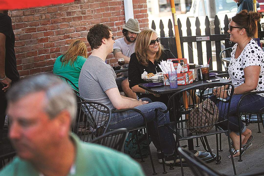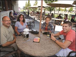 From left: Wauseon residents Randy and Sherrie Heldman, Lacy Mynhier, and Adam Moose sit on the patio at Granite City at Fallen Timbers Shopping Mall in Maumee.