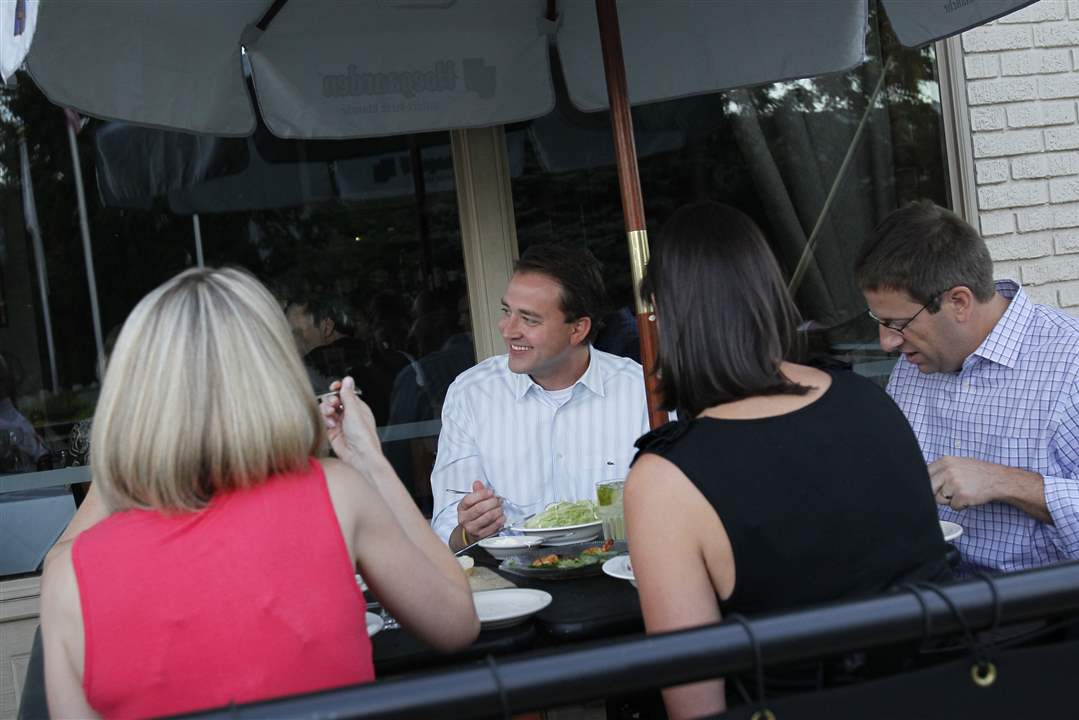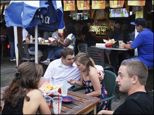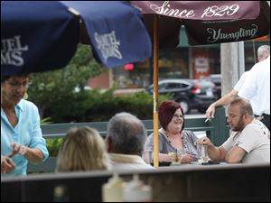 Katie Wenger, of West Toledo, center left, and Frank Alenmdan, of New York, right, share dinner on the patio of the Village Inn.