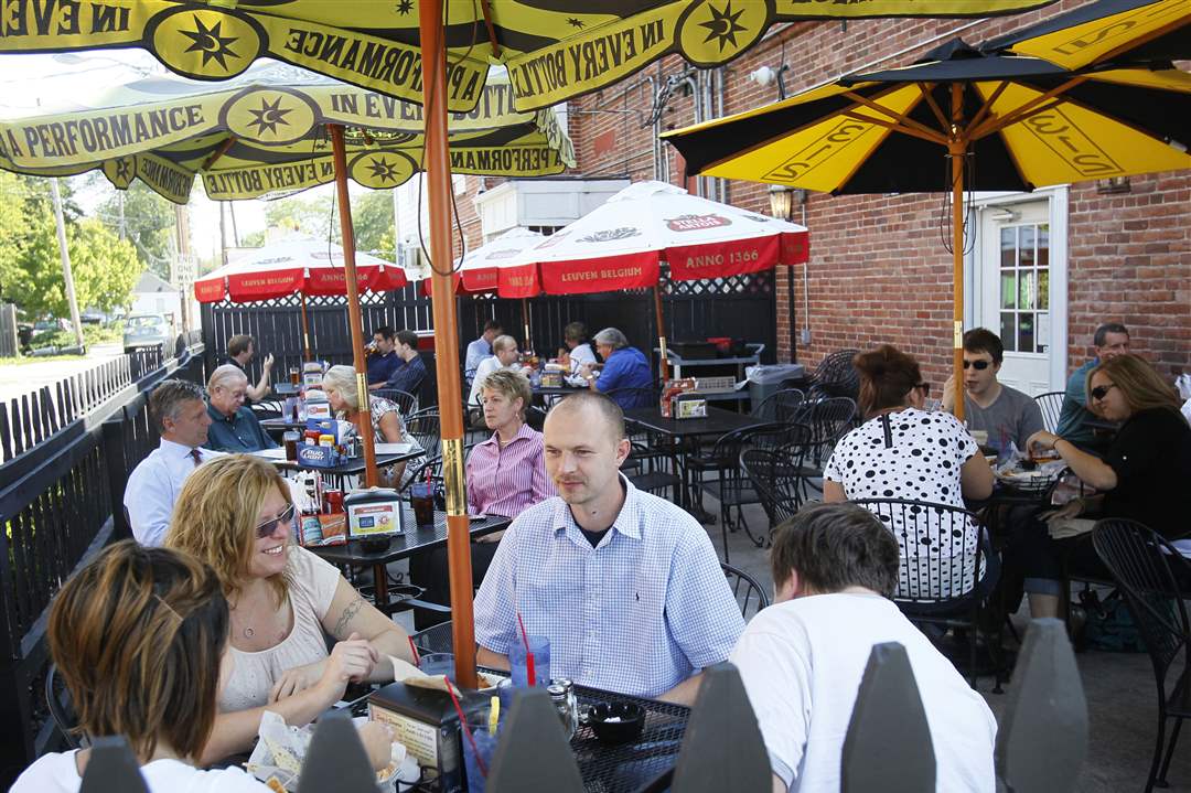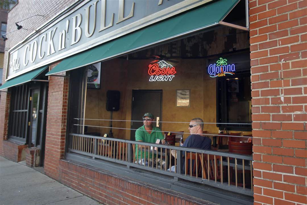 ET Trychel, left, and Mike Digby, right, from Toledo, enjoy the patio at Ye Olde Cock N' Bull Tavern.
