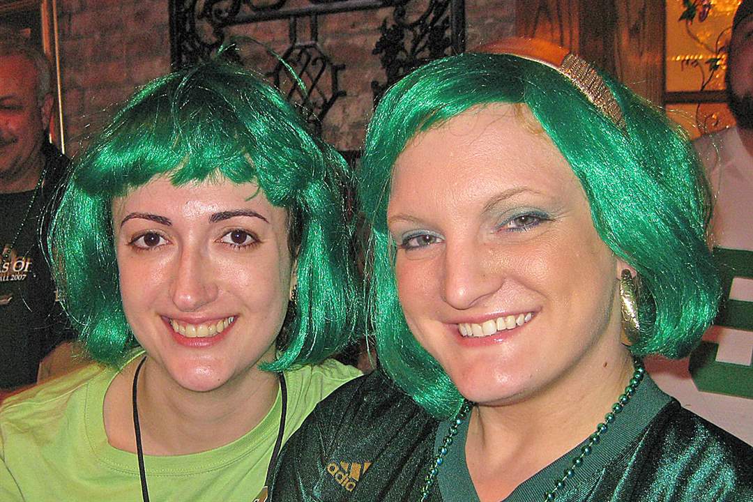 Cara D'Amato and Sarah Nadolny sport green wigs.