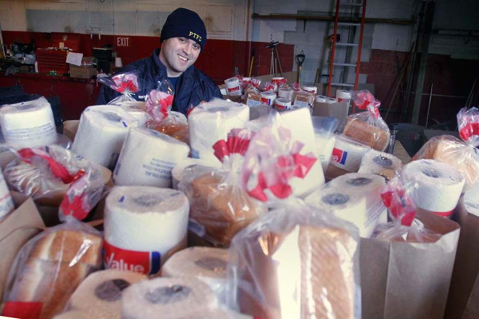 Perrysburg Township firefighter Jake Hoffman helps organize the food bags.