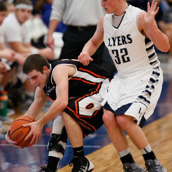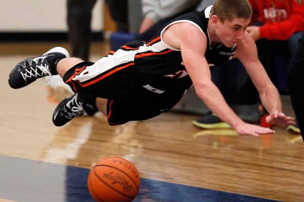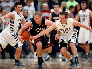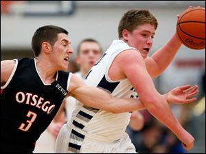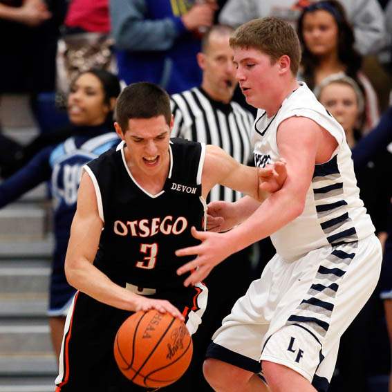 Lake's Todd Walters (10) comes up with a loose ball against Otsego's Schyler Scherff (20).