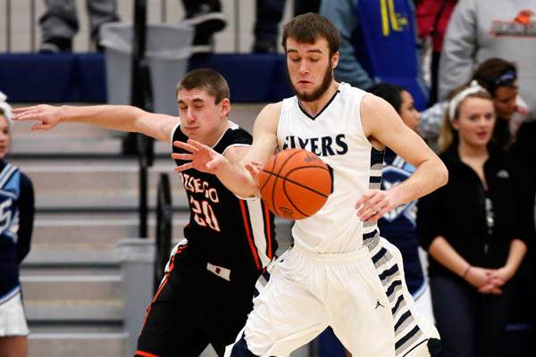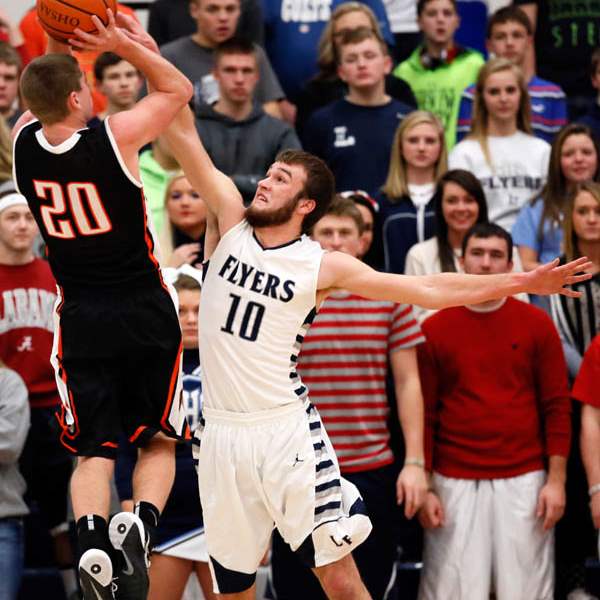 Lake's Jacob Rettig (22) shoots against Otsego's Schyler Scherff (20).