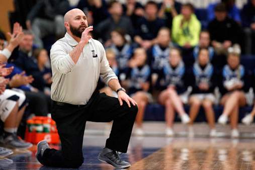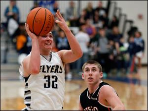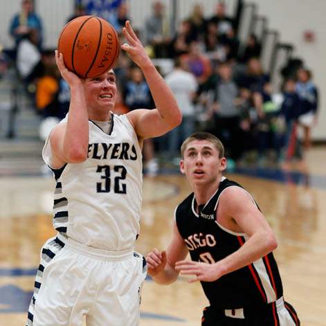 Lake's Connor Bowen (32) shoots against Otsego's Schyler Scherff (20).