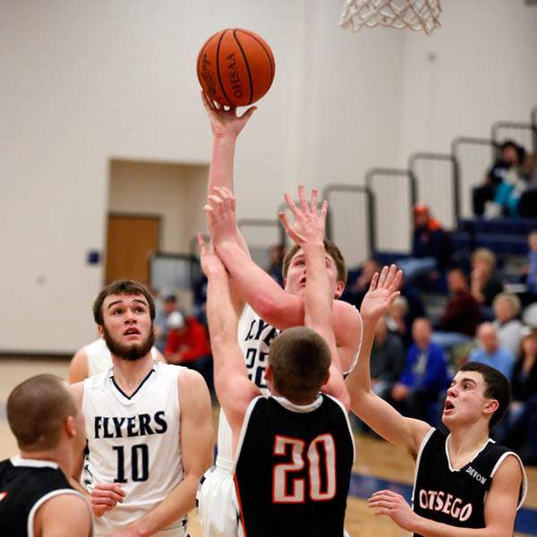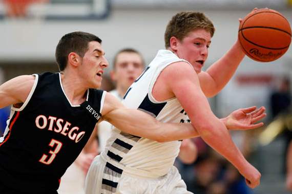 Otsego's Josh Horseman (10) pulls in a rebound against Lake's Todd Walters (10).