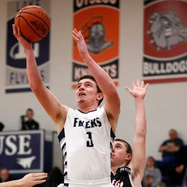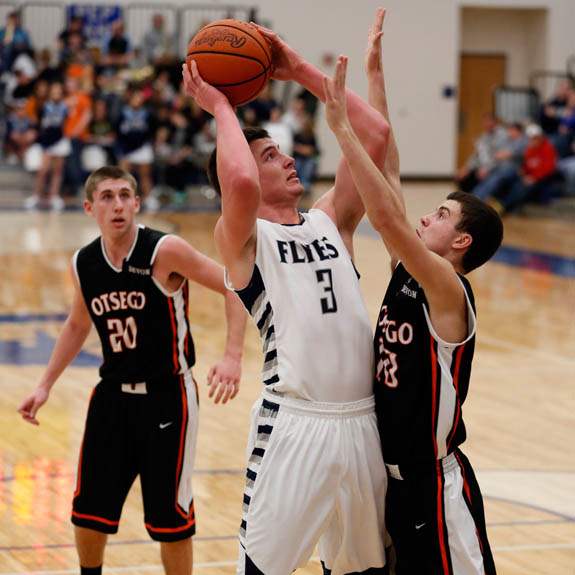 Lake's Jared Rettig (3) shoots against Otsego's Josh Horseman (10).