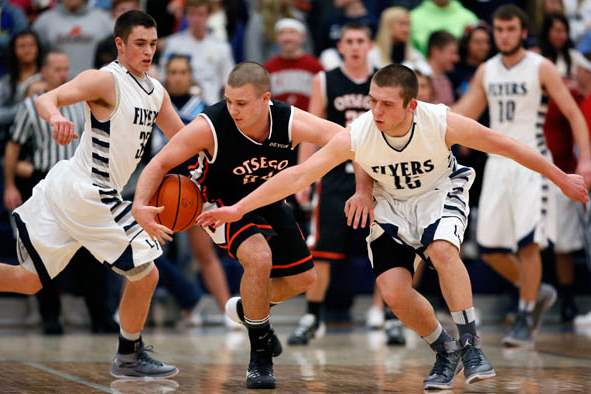 Lake's Cody Witt (15) and Connor Bowen (32) defend against Otsego's Cody Downs (22).