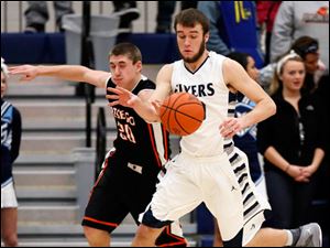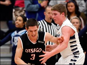 Lake's Jacob Rettig (22) steals from Otsego's Jalen Myers (3).