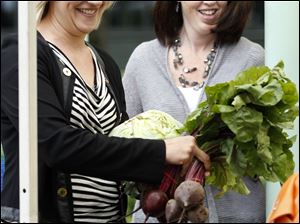 Jennifer Hummel of Andy Keil Greenhouse, left, hands bags of fresh produce to Owens Corning employee Joyce Baranek, right.