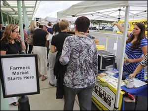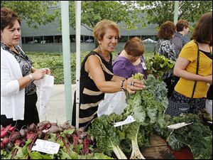 DeAnna Starn, an employee at Owens Corning, buys fresh produce at the Toledo Farmers' Market, setup outside the OC headquarters in downtown Toledo on Wednesday, July 31, 2013. Behind her is co-worker Angie Grosjean.