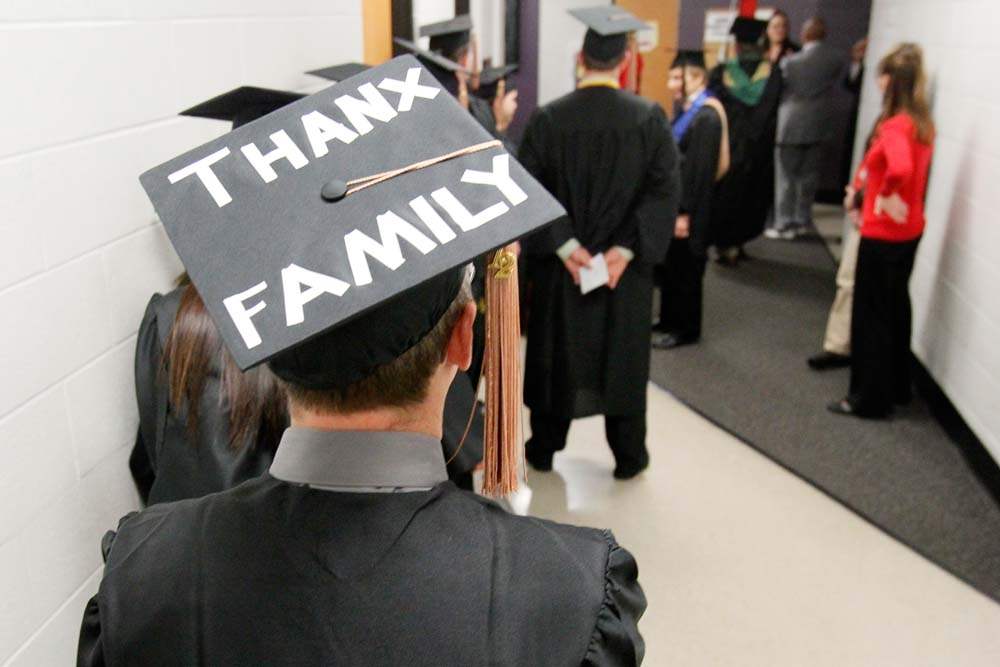 WEBPerry owensgrad14p Careigh Hand, of Maumee, right, snaps a picture just before the start of the ceremony Friday evening during the 32d Fall Commencement at Owens Community College in Perrysburg Township. Several hundred students and their families packed the gym at the Student Health and Activities Center for commencement. THE BLADE/KATIE RAUSCH