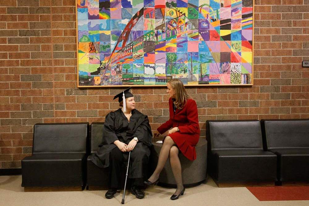 Michelle Weber, of West Toledo, left, shares a word with Owens dean of enrollment services Betsy Johnson.