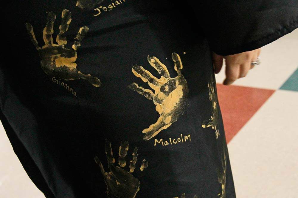 Christina Courtney, of Perrysburg, had a few of the children from the class where she student teaches put handprints on her gown. Courtney received an associates degree in early childhood education.