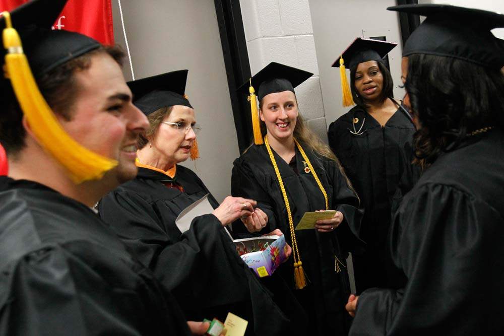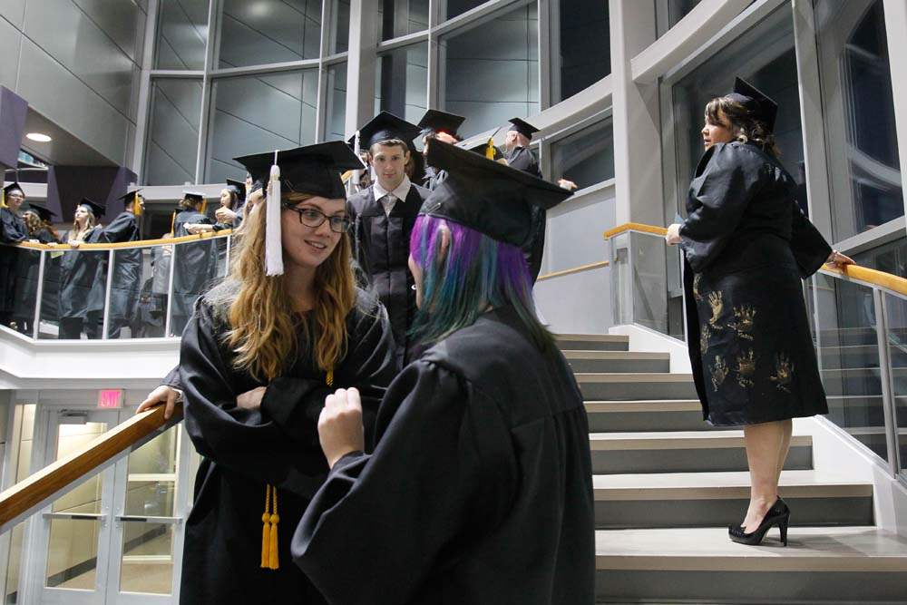 Christina Courtney, of Perrysburg, right, waits with other graduates for the start of Friday evening's 32nd Fall Commencement.