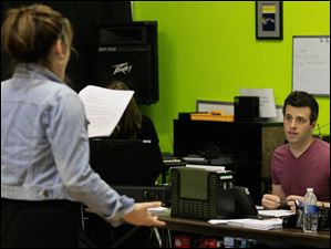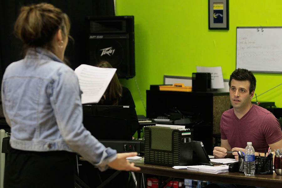 Director Clark Ausloos, left, gives another song to Perrysburg High senior Morgan Brunsman during her audition.