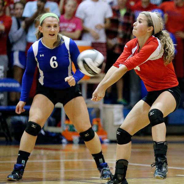 Springfield's Libby Mathewson (4) and Allie Hale (13) return a Perrysburg serve.