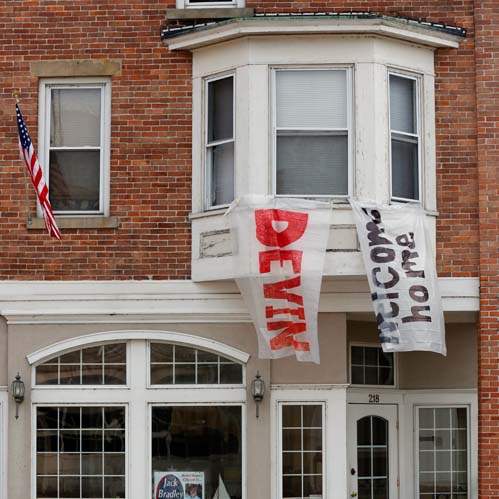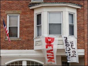 Snow created from ice chips and 'welcome home' signs outside Devin Kohlman's apartment are signs of support from the Port Clinton community.