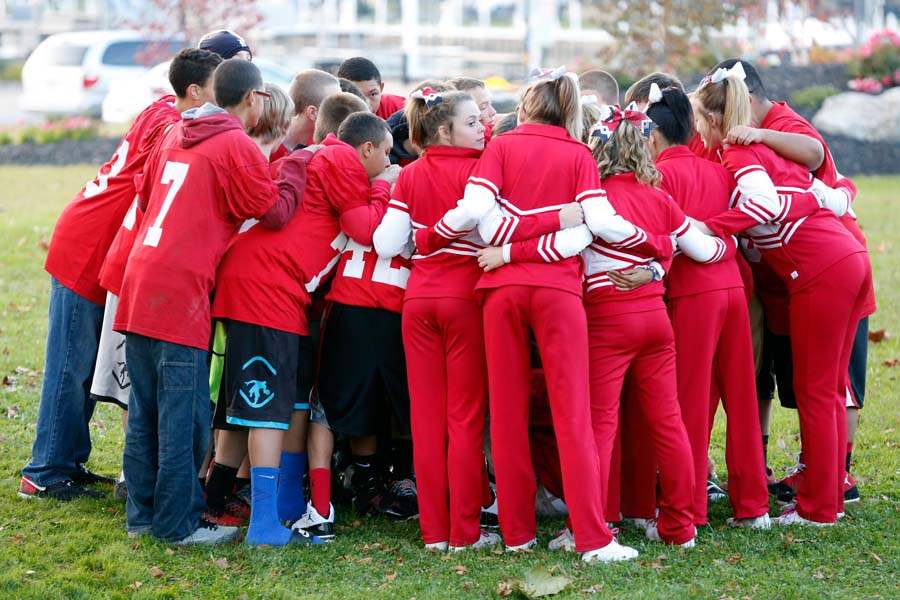 Eighth grade football players and cheerleaders huddle during a pep rally for Devin Kohlman.