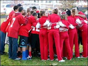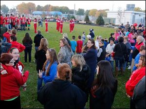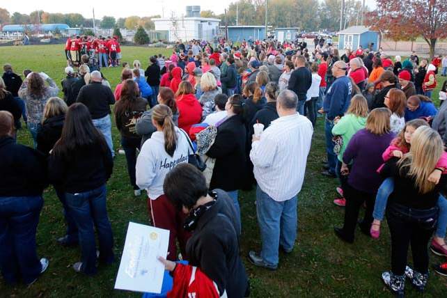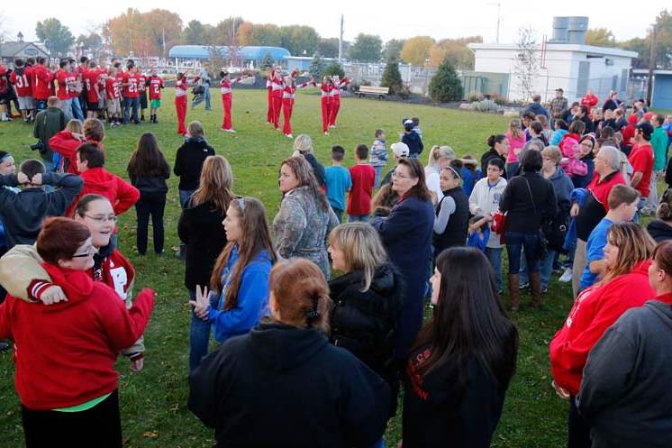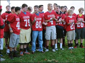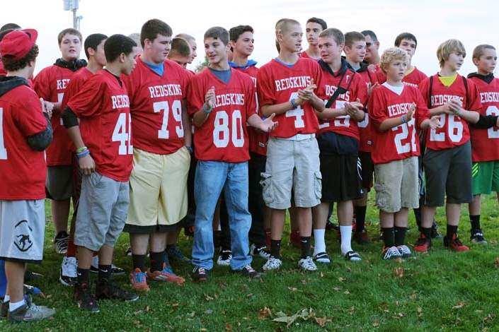The Port Clinton eighth grade football team attends a pep rally for Devin Kohlman at Waterworks Park in Port Clinton.