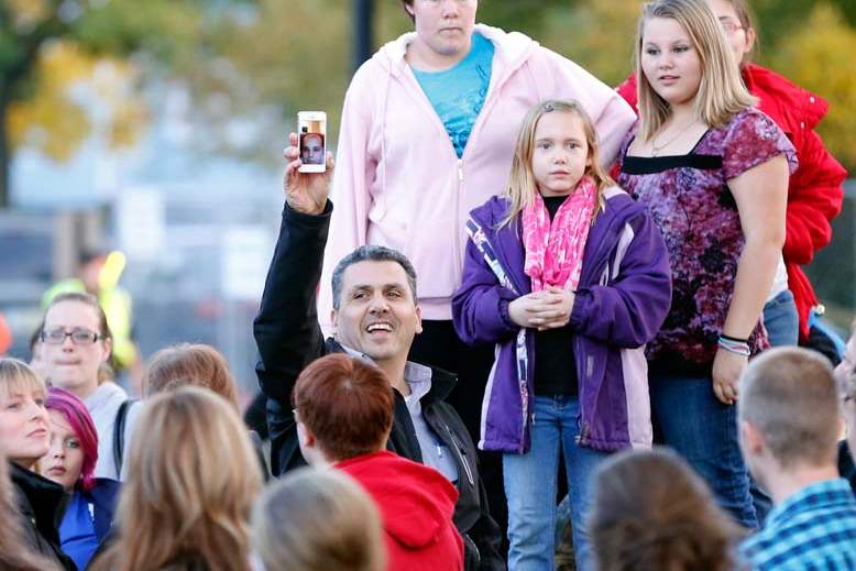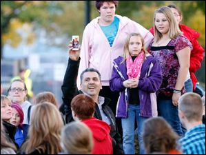 Port Clinton Mayor Vincent Leone holds up his cell phone with Devin Kohlman on it during a pep rally.