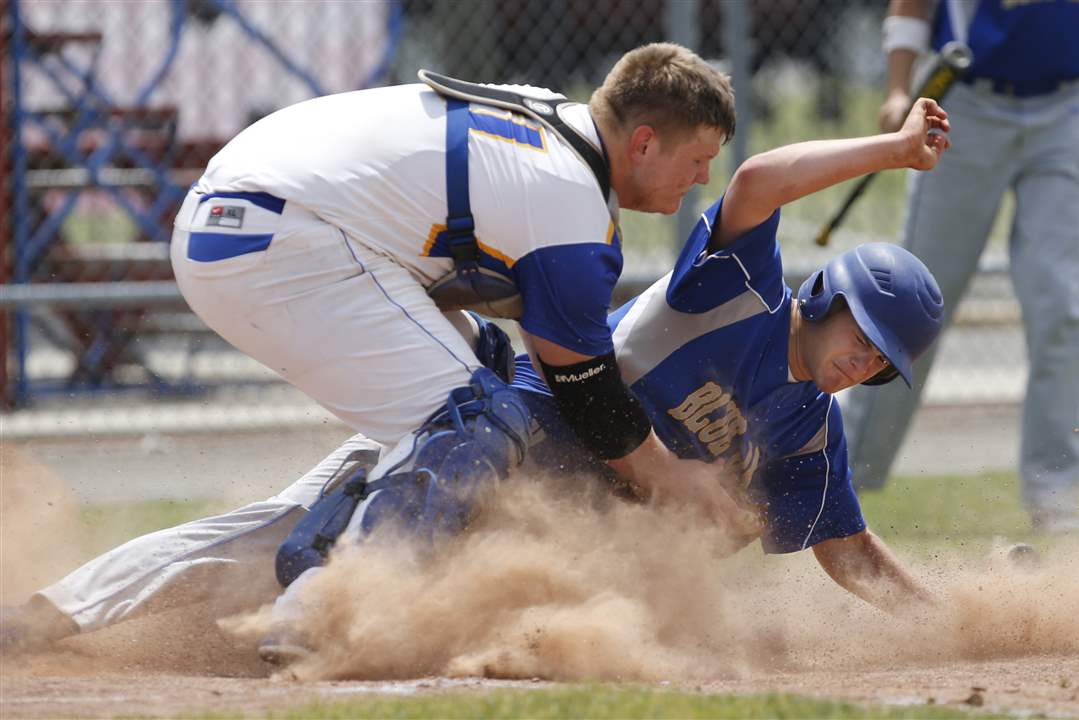 Northwood catcher Myles Habel (21) tags out pitcher Curtis Geise (15) at the plate.