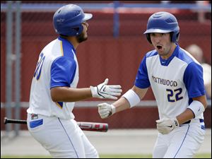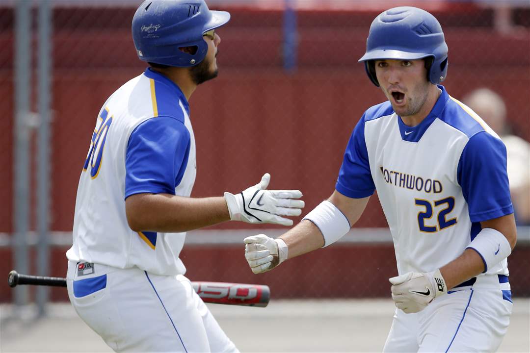 Northwood's Evan Perkins (22) celebrates scoring a run with Justin Rohrs (30).