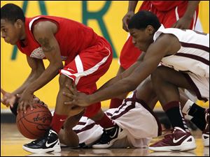 Bowsher's Kharri Dailey (4) battles Scott's Delaquon Norwood (10) and Arvell Harris (24) for a loose ball.