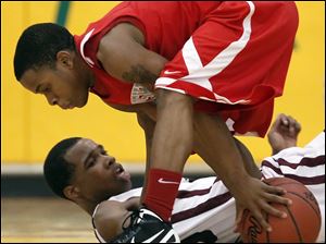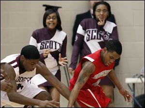 Bowsher's Kharri Dailey (4) battles Scott's Delaquon Norwood (10) for a loose ball.