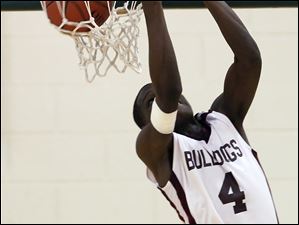 Scott's Shaquille Allen (4) dunks the ball against Bowsher during the City League boys semifinals at Start High School.