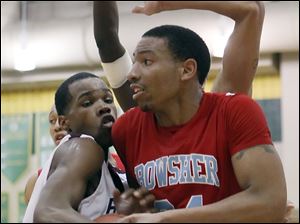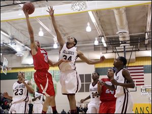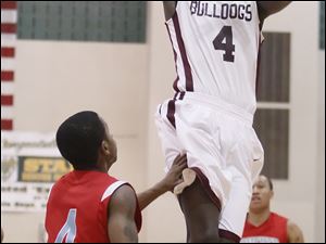 Bowsher's Mookie Mustaffa (24) goes to the net against Scott's Delaquon Norwood (10).